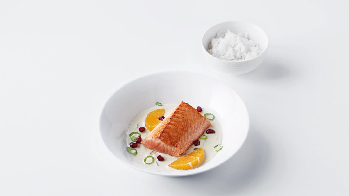 - Anrett laksen på sausen og pynt med appelsinskiver og granateplekjerner. Du kan også drysse litt hakket vårløk over.