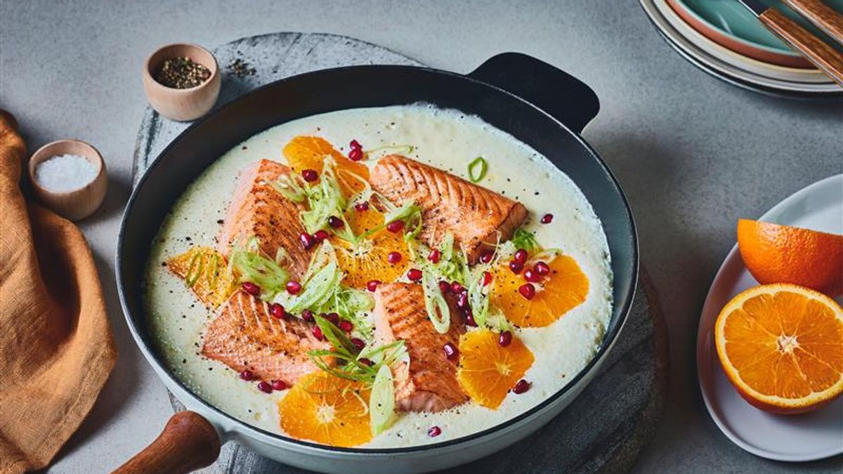 - Fordel appelsinskivene, finsnittet vårløk og granatepleperler over retten og server kokt ris med soyasaus til.