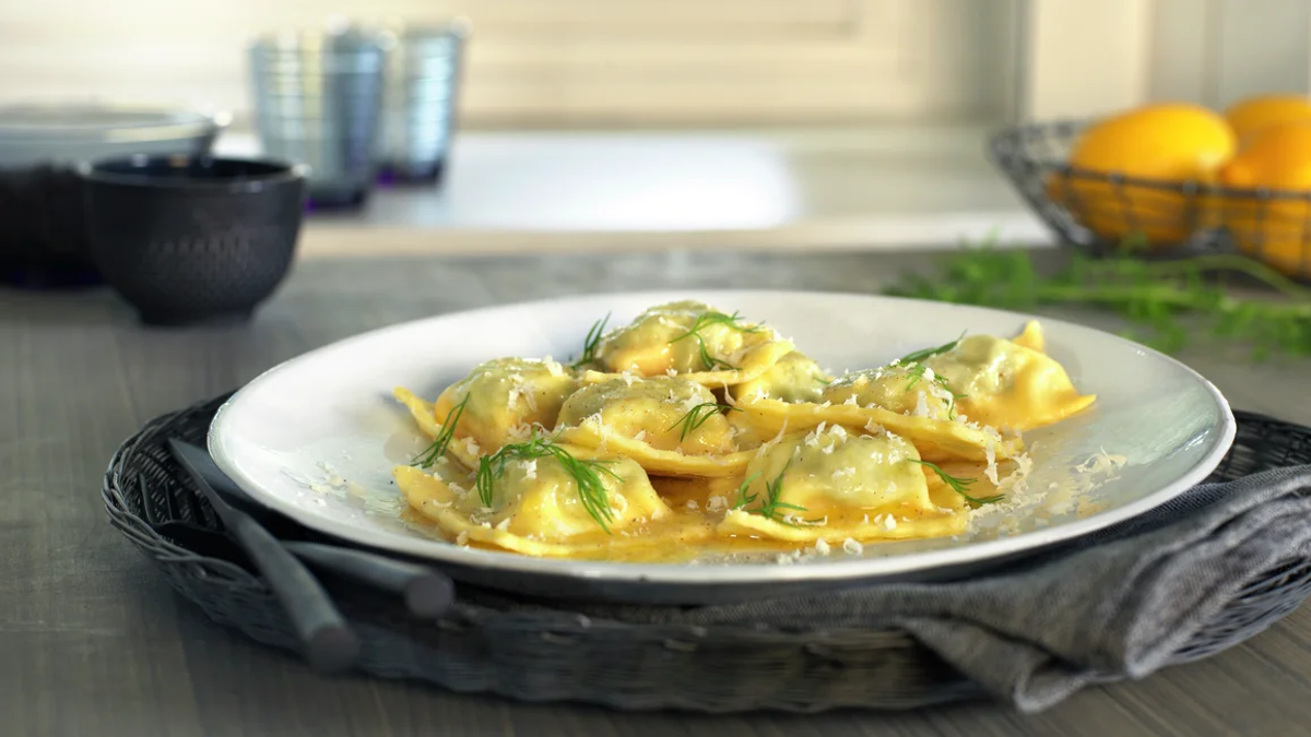 - Anrett ravioliene i dype tallerkener og hell litt av smørsausen over. Dryss over revet parmesan og dill før servering.