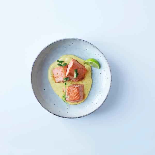 Laks med créme fraîche og mango-chutney