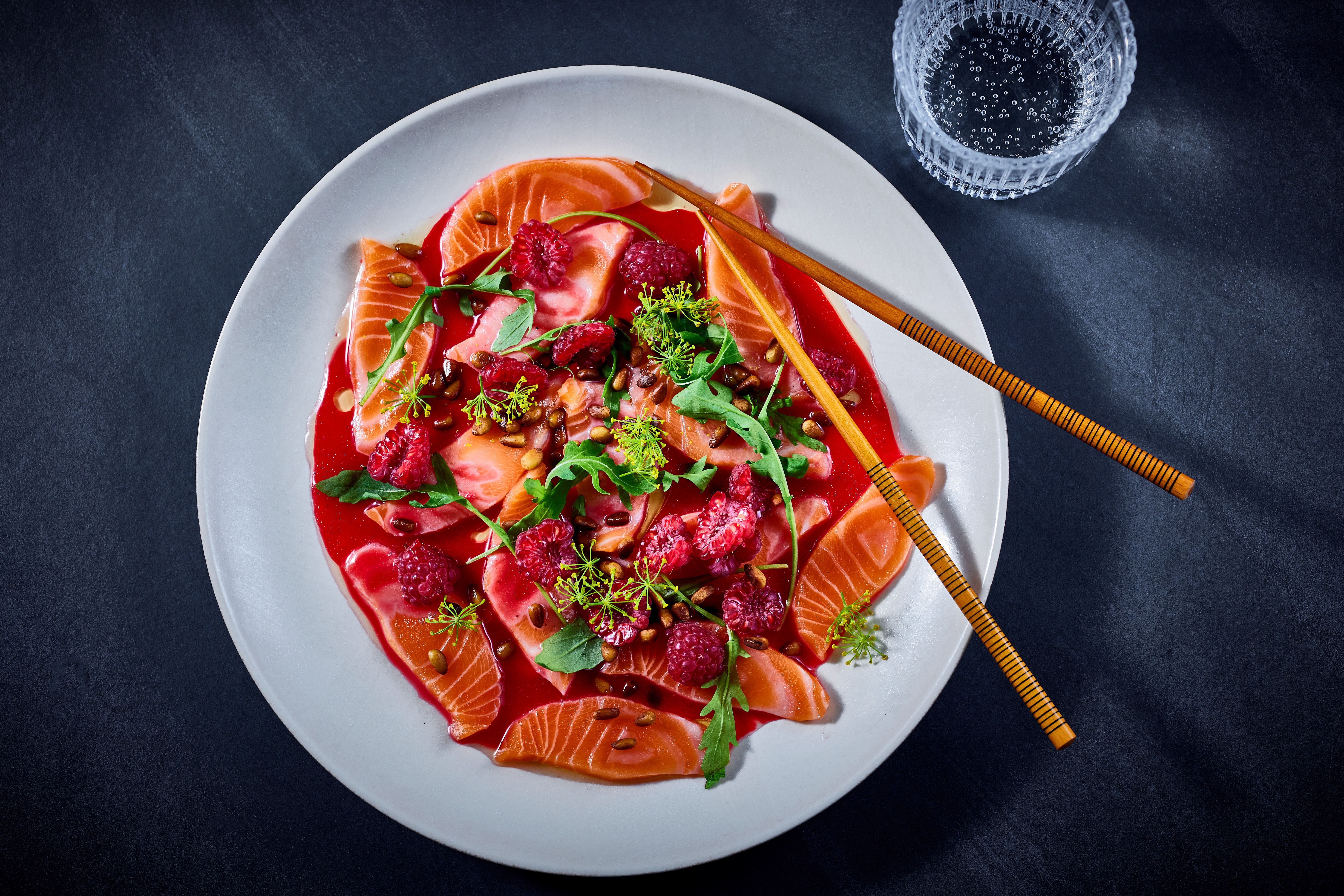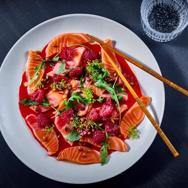 Lakse-crudo med bringebær