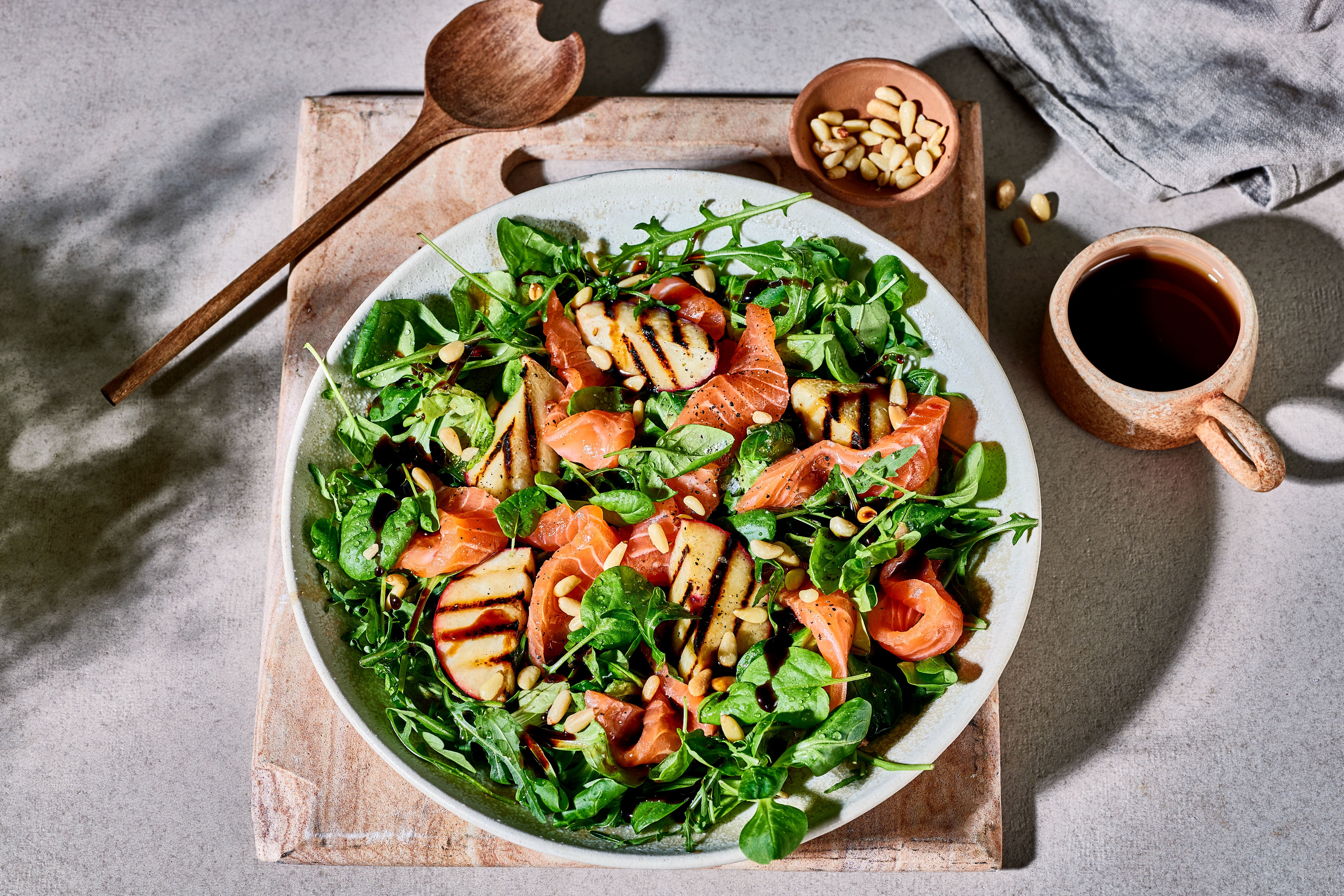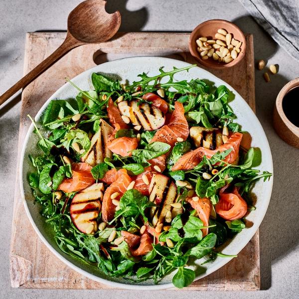 Frisk salat med laks og grillet fersken